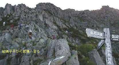 紀美子平で朝食後、ザックを置いて前穂に登る。落石の起きやすそうな急登だ。休むときは、くれぐれも頭上に注意したい。3,090mの山頂に立てば吊尾根が主峰奥穂へと続き、右へ涸沢岳、北穂高岳、槍ケ岳が連なり、下には涸沢カール。奥穂の左には西穂高岳、焼岳、足下の岳沢・上高地を隔てて六百山、霞沢岳と良い眺めだ。明神岳も眼下だ。常念岳方面はガスで見えなかった。山頂は広く、ゆっくりしたいところだが、先もあるので止む無く下山。紀美子平までもどり奥穂へと向う。