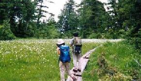 ![]() 御池駐車場の西端にある入山者カウンターを通りぬけて、燧裏林道を行くと、すぐに燧ケ岳登山道を左に分ける。 やがて上田代(尾瀬ヶ原の上田代とは違う)、横田代と湿原に入る。表側の大江湿原ほどではないが、バスに乗る必要も無く、静かなハイキングには丁度良い。 湿原にはワタスゲが白く広がり、ハイカーも撮影に余念がない。 (99/07/20) |